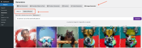 Go to the MagicAI > Generators > Image Generator. Above the input field, you will see the DALL-E and Stable Diffusion options. There you can choose the AI generator to use.